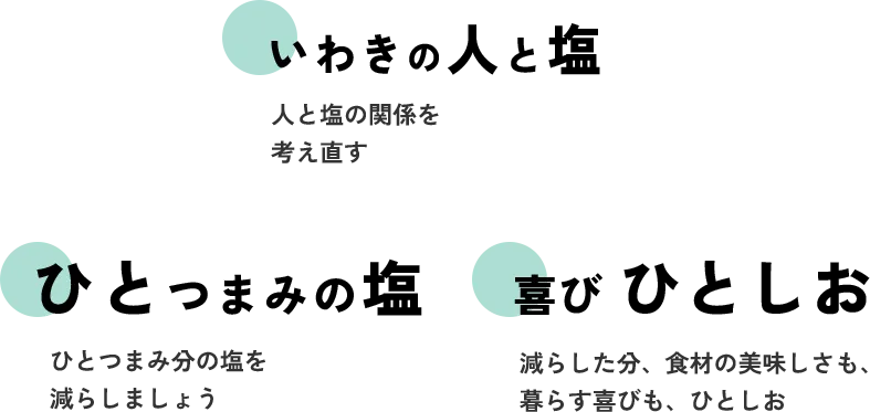 いわき ひとしおとは 減塩による市民の高血圧予防・改善につなげることを目的に、 地場産品を活用した減塩商品の開発や 減塩食品のPR活動に取り組んでいます。